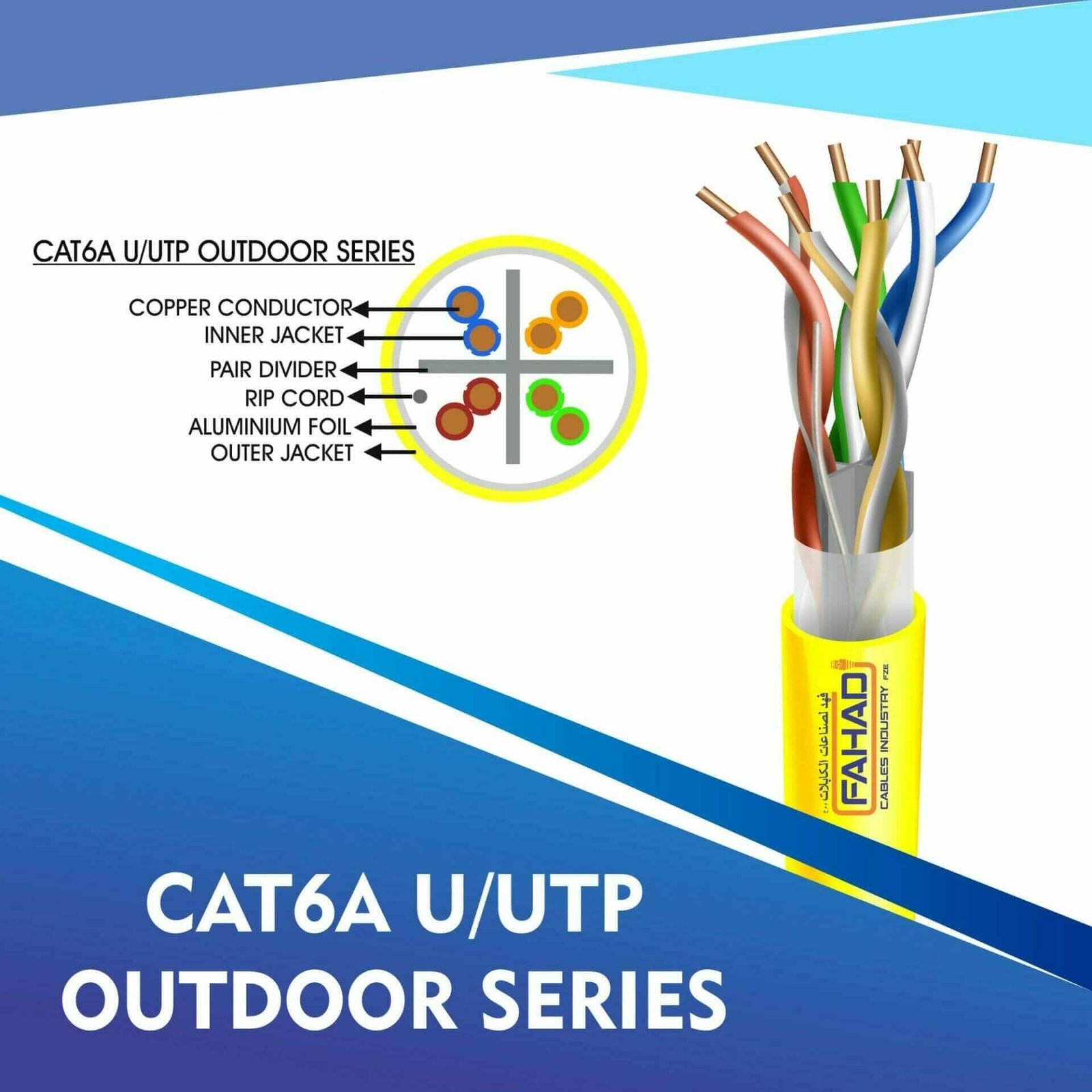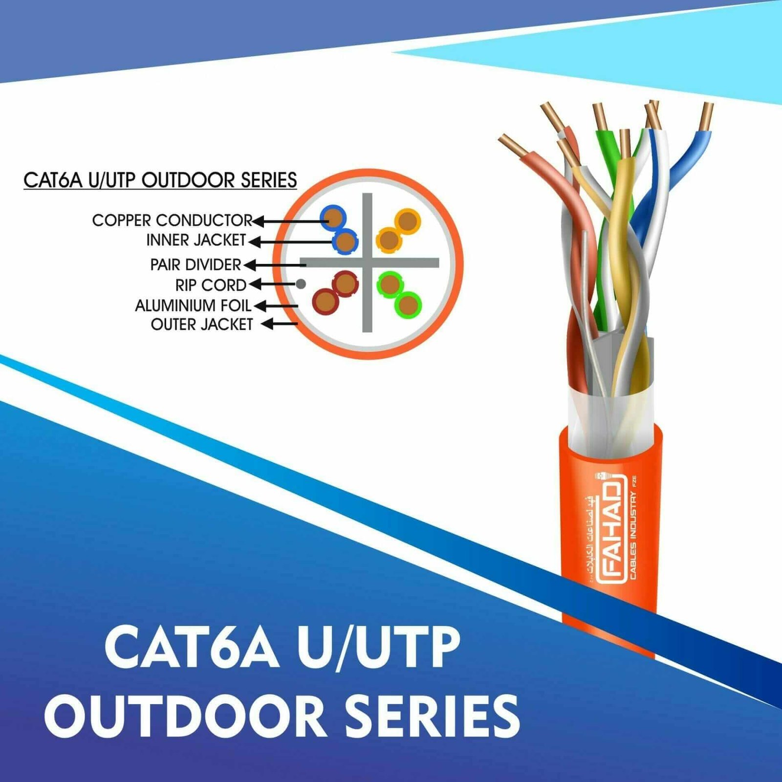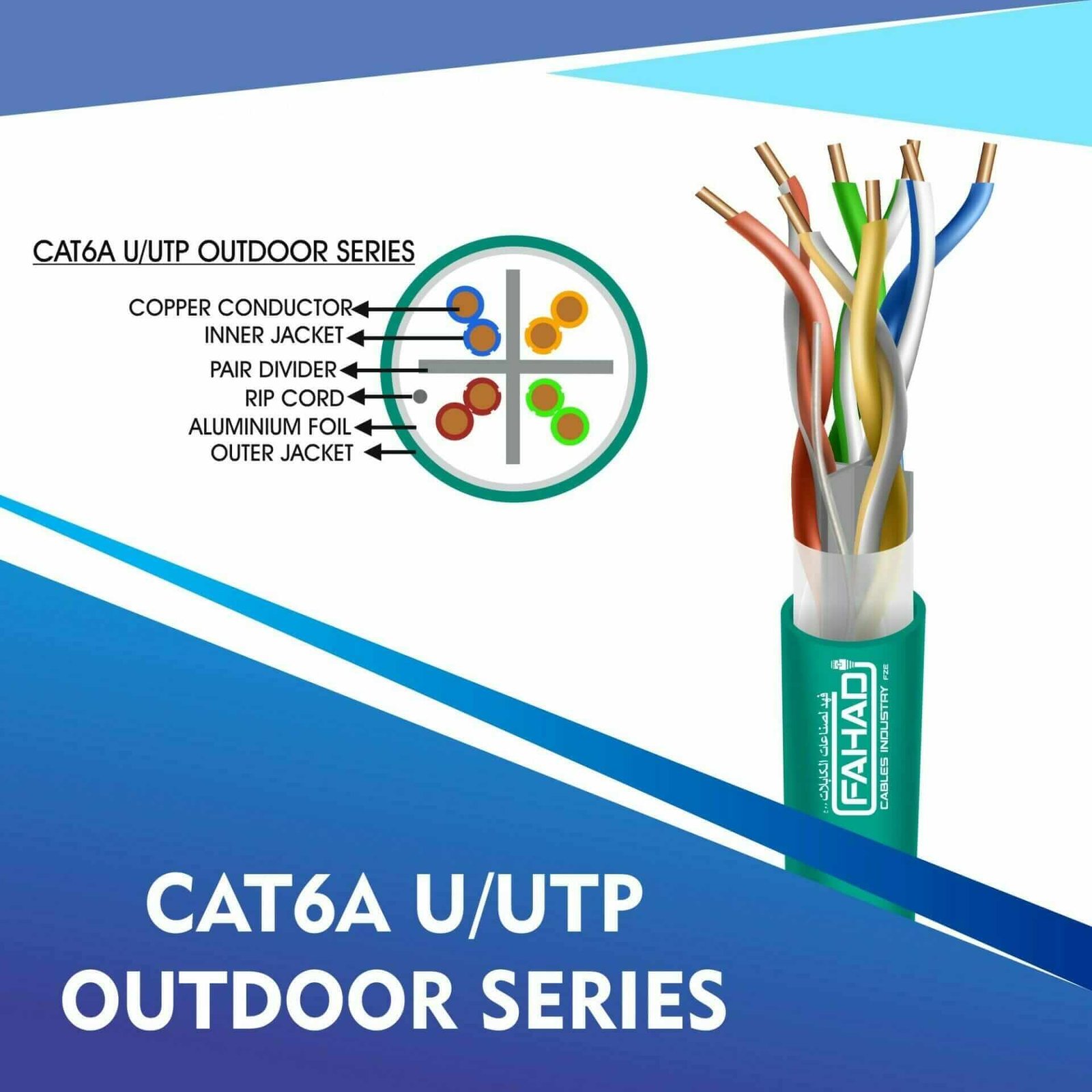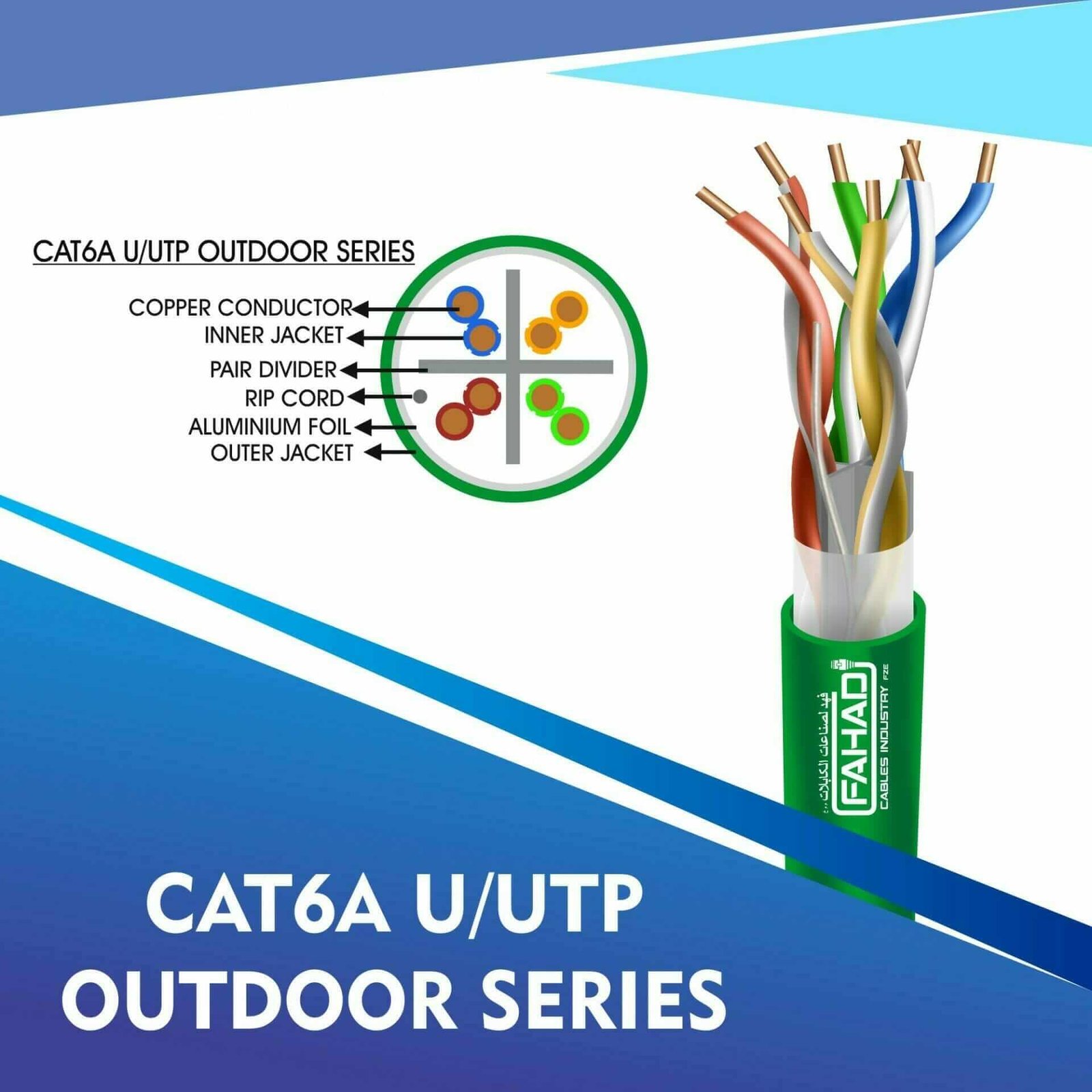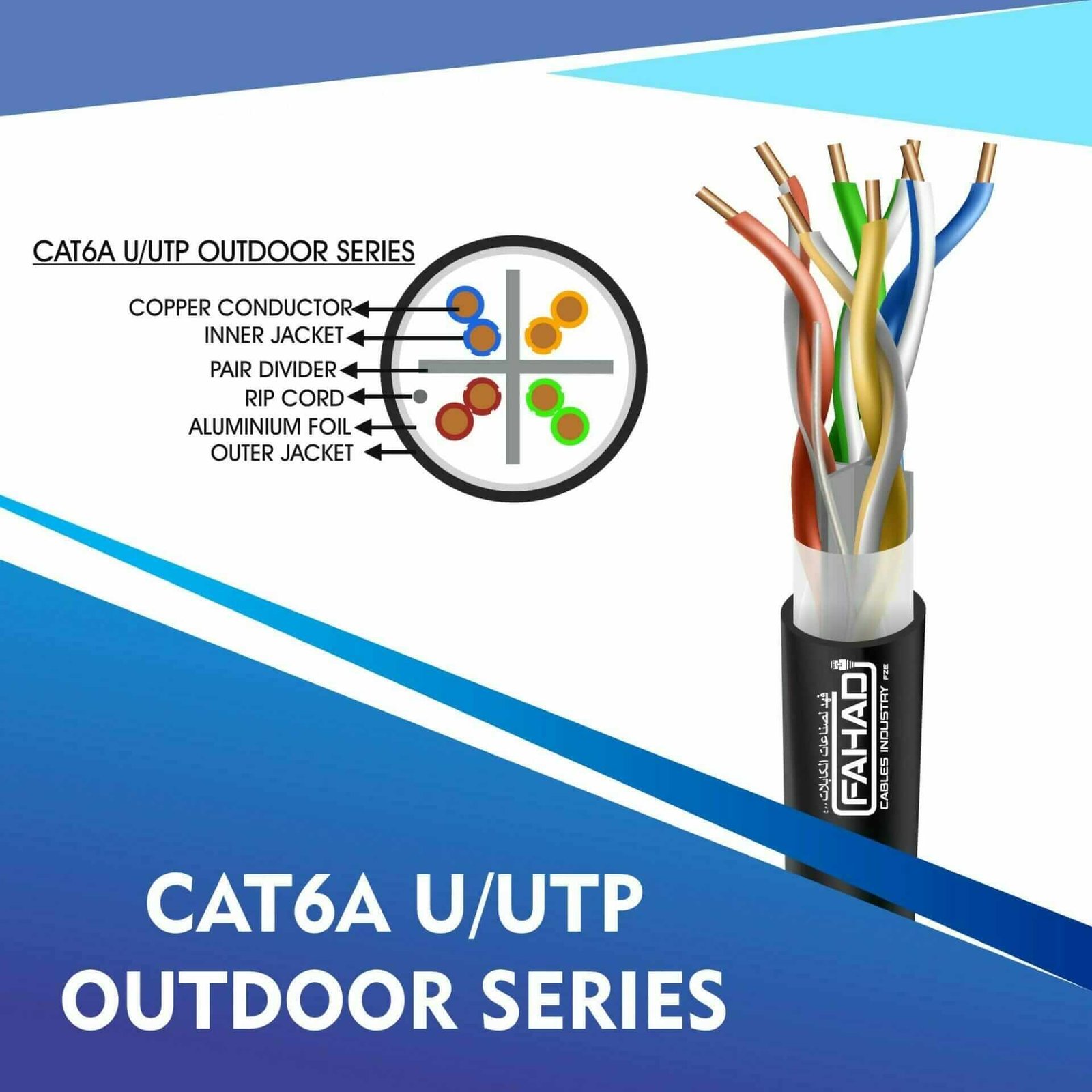 FAHAD CABLES cat 6a outdoor cable Black network 23 awg 4 pair 305m are Manufactured Tested and Complied with ANSI/TIA/568.2-D CENELEC EN 50288-5IEC 61156-5 (ISO/IEC-11801 Class -Ea). Cat6a Series is Designed to Ensure the Highest levels of performance, reliability, and longevity, and are ideal for large enterprise and small business.
