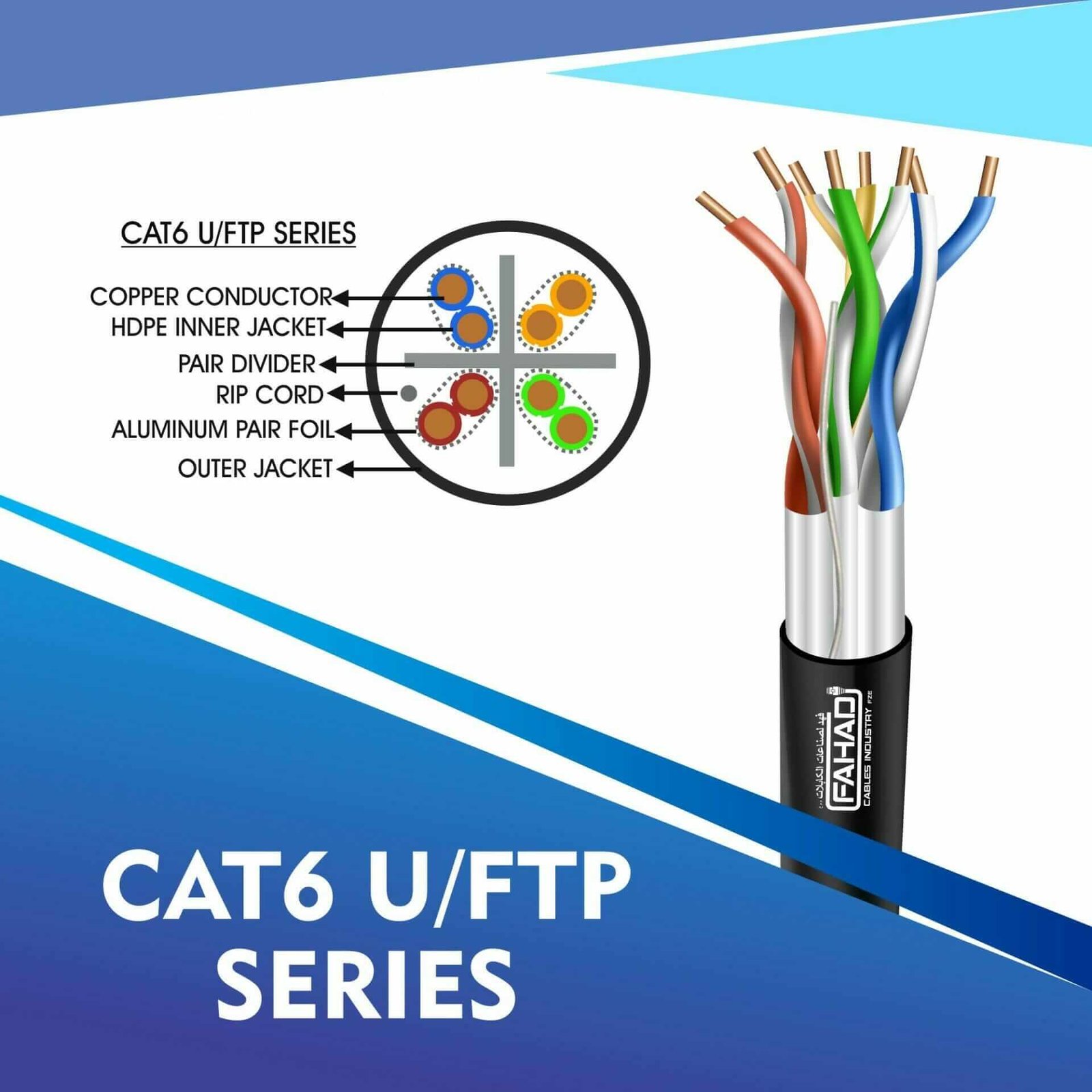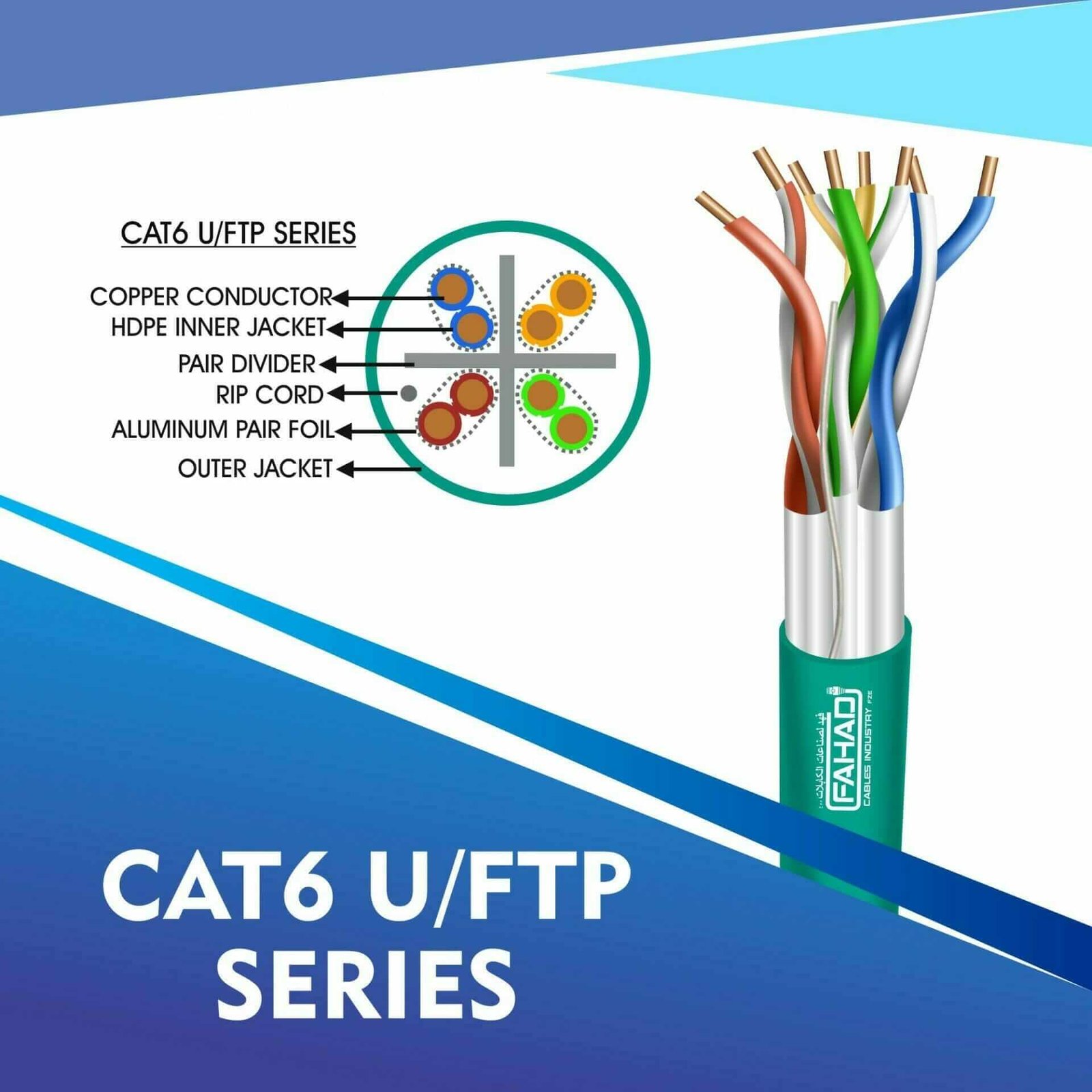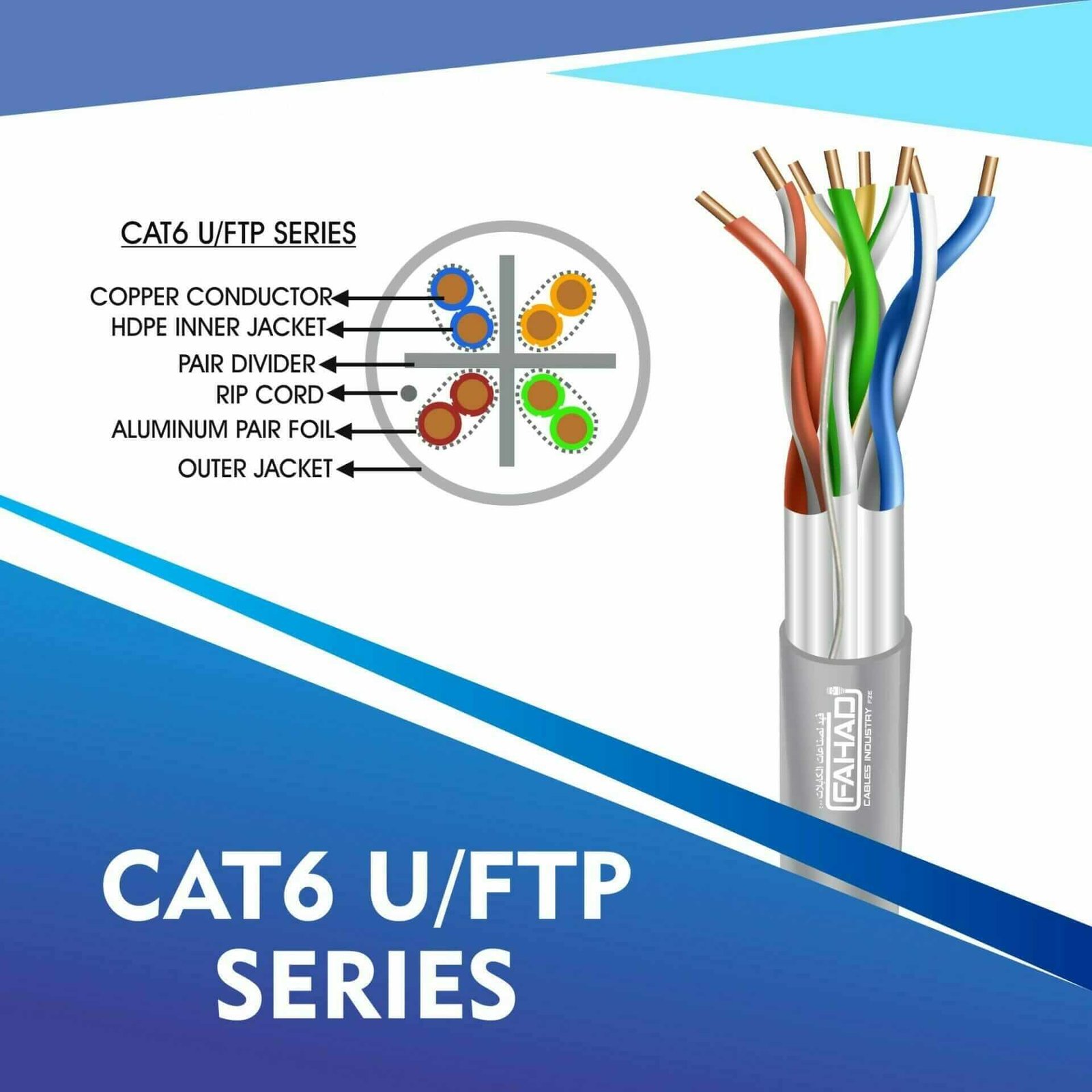 FAHAD CABLESÂ cat6 u/ftp cable 305m are Manufactured Tested and Complied with ANSI/TIA/568.2-D CENELEC EN 50288-5IEC 61156-5 (ISO/IEC-11801 Class -Ea). Cat6a Series is Designed to Ensure the Highest levels of performance, reliability, and longevity, and are ideal for large enterprise and small business.cat6 23 awg 4 twisted pair u/ftp network cable 305-500m