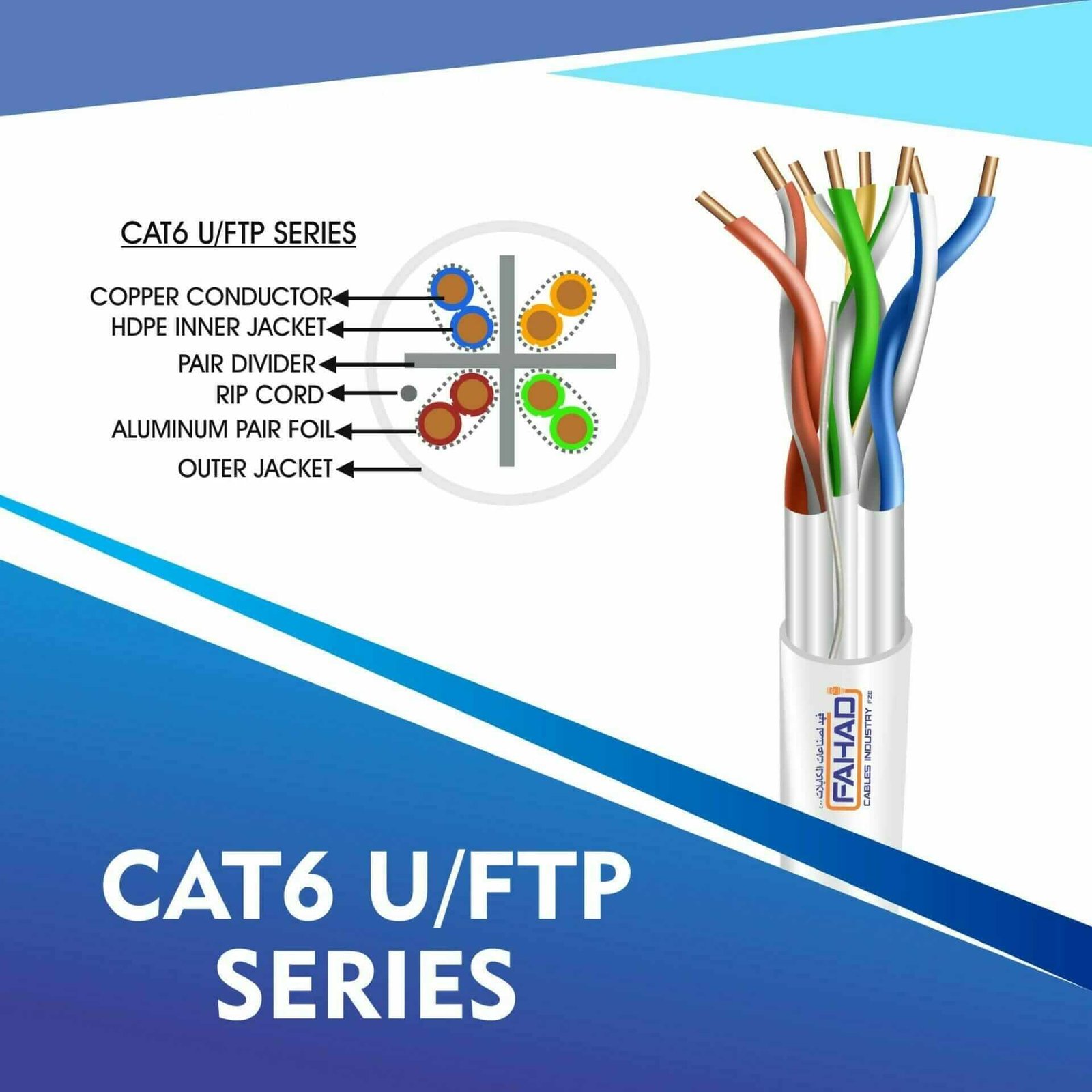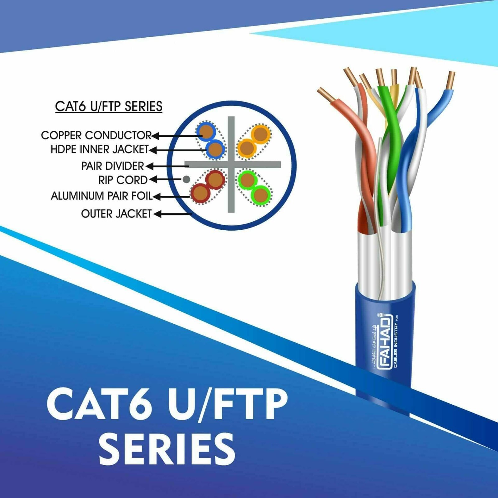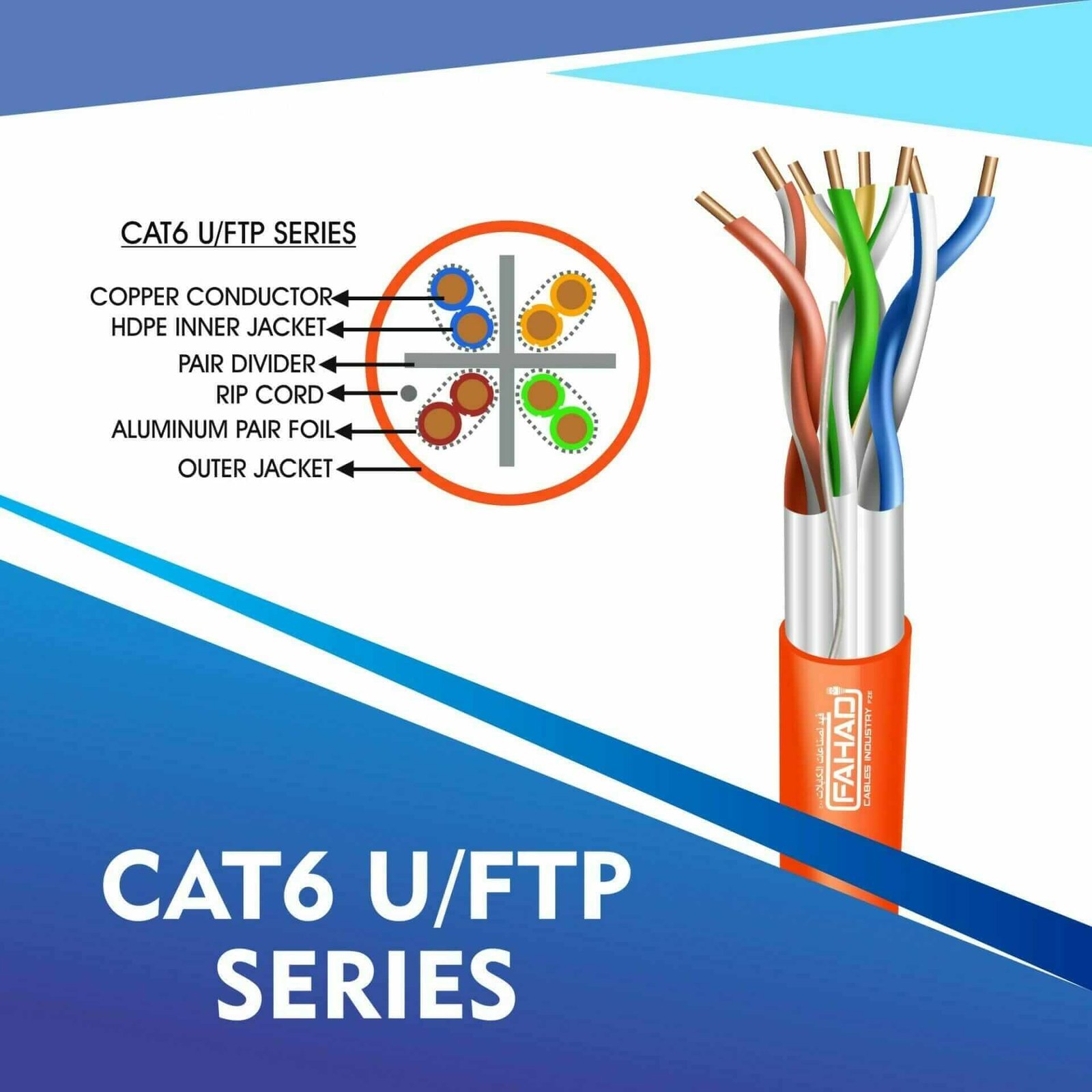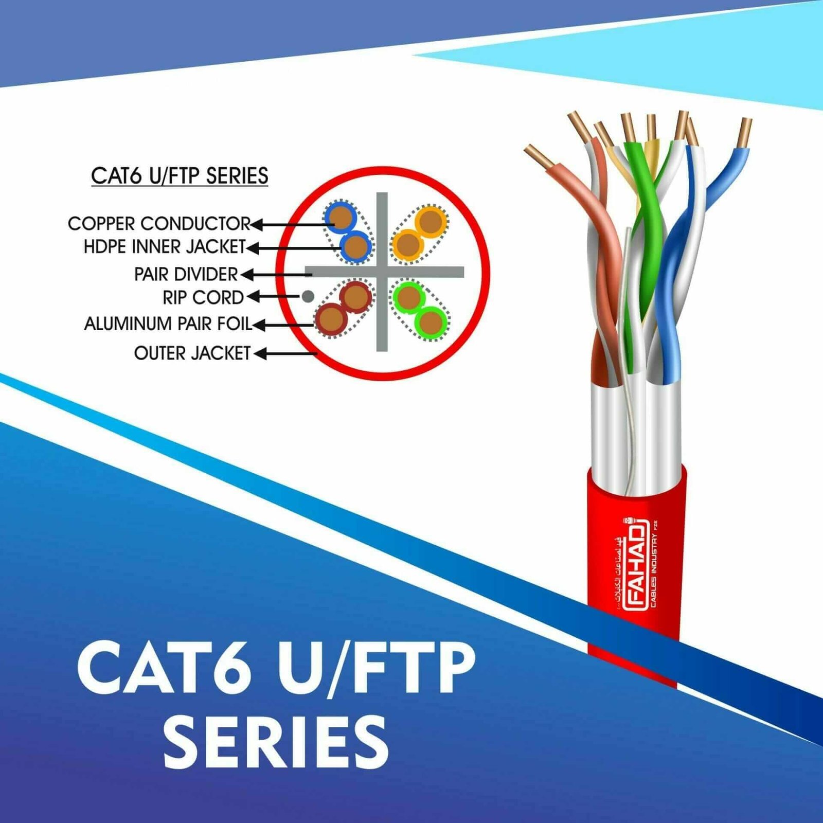 FAHAD CABLESÂ cat6 u/ftp cable 305m are Manufactured Tested and Complied with ANSI/TIA/568.2-D CENELEC EN 50288-5IEC 61156-5 (ISO/IEC-11801 Class -Ea). Cat6a Series is Designed to Ensure the Highest levels of performance, reliability, and longevity, and are ideal for large enterprise and small business.cat6 23 awg 4 twisted pair u/ftp network cable 305-500m
